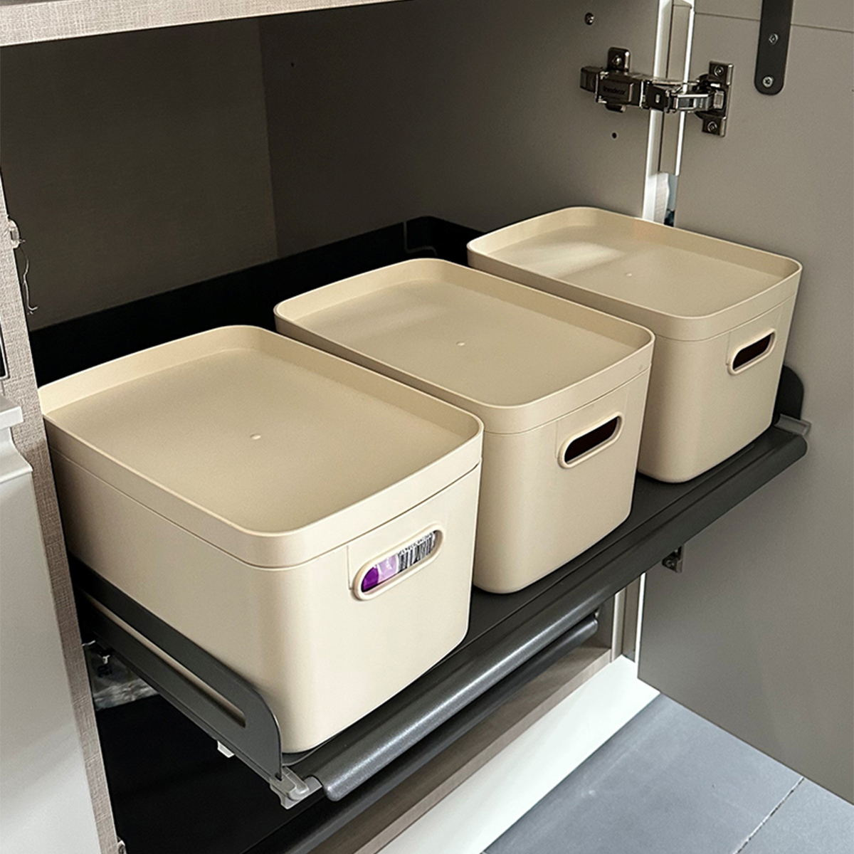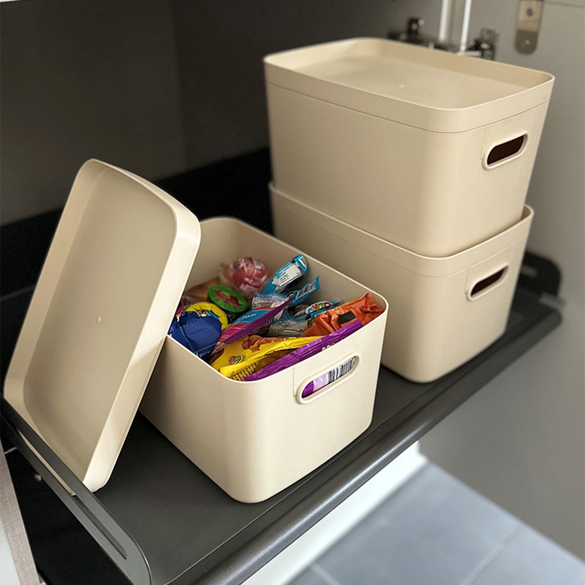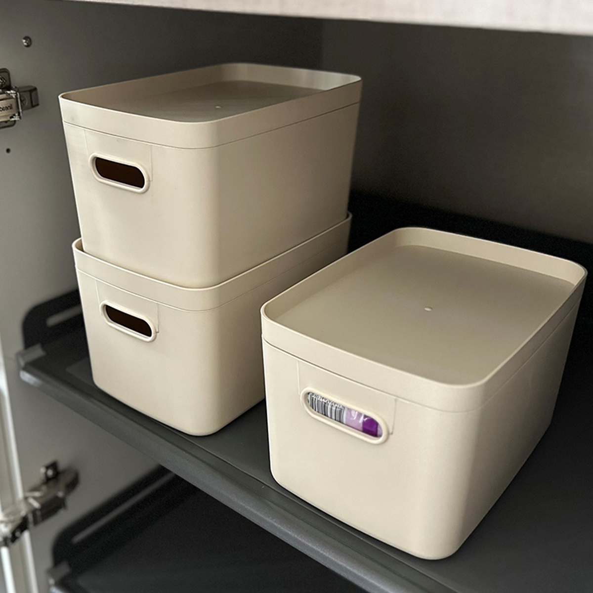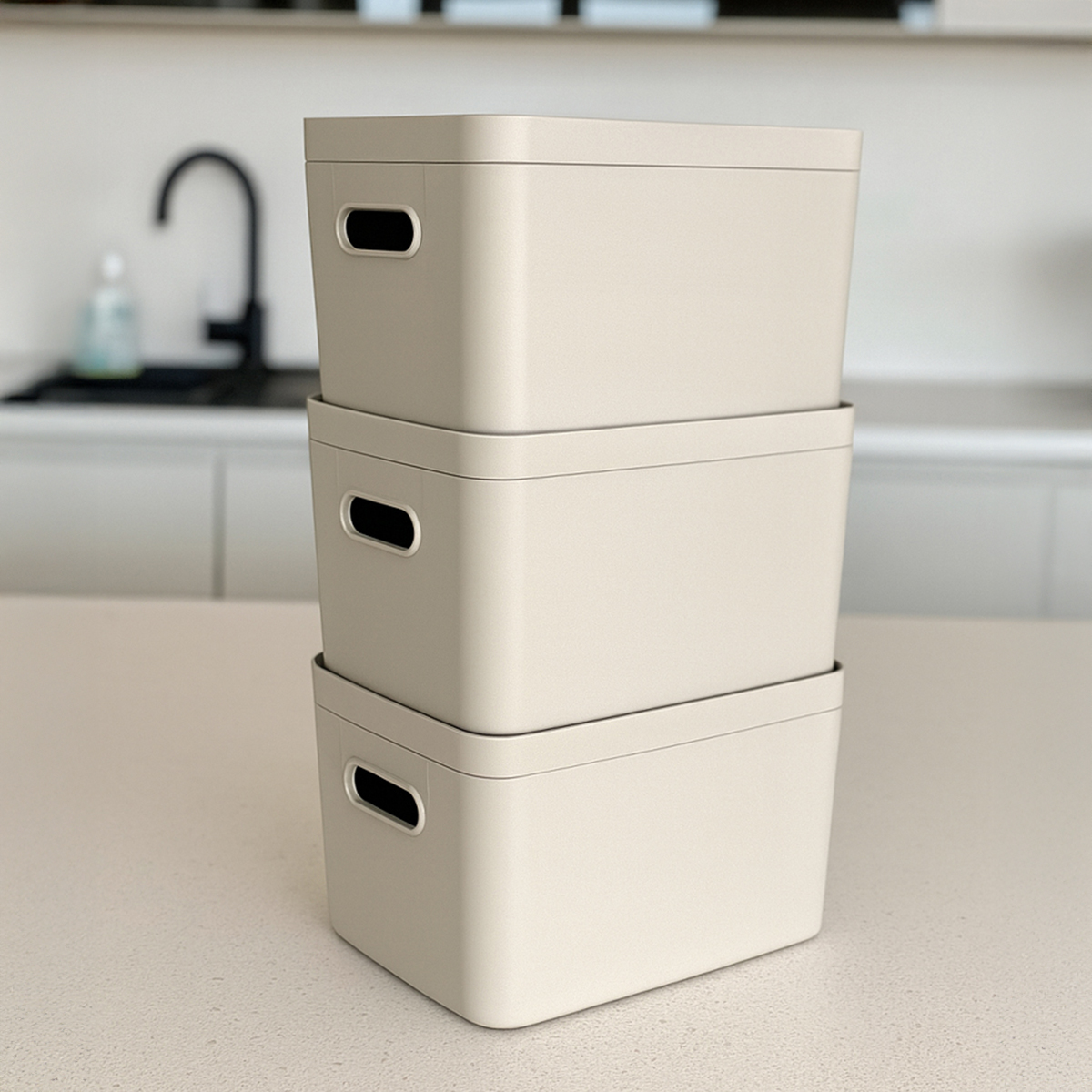 Set Contents: 3 Deep Boxes Width: 17 cm Length: 24 cm Height: 13 cm 3 Lids Width: 17 cm Length: 24 cm Height: 3 cm Total Stacked Height: 48 cm