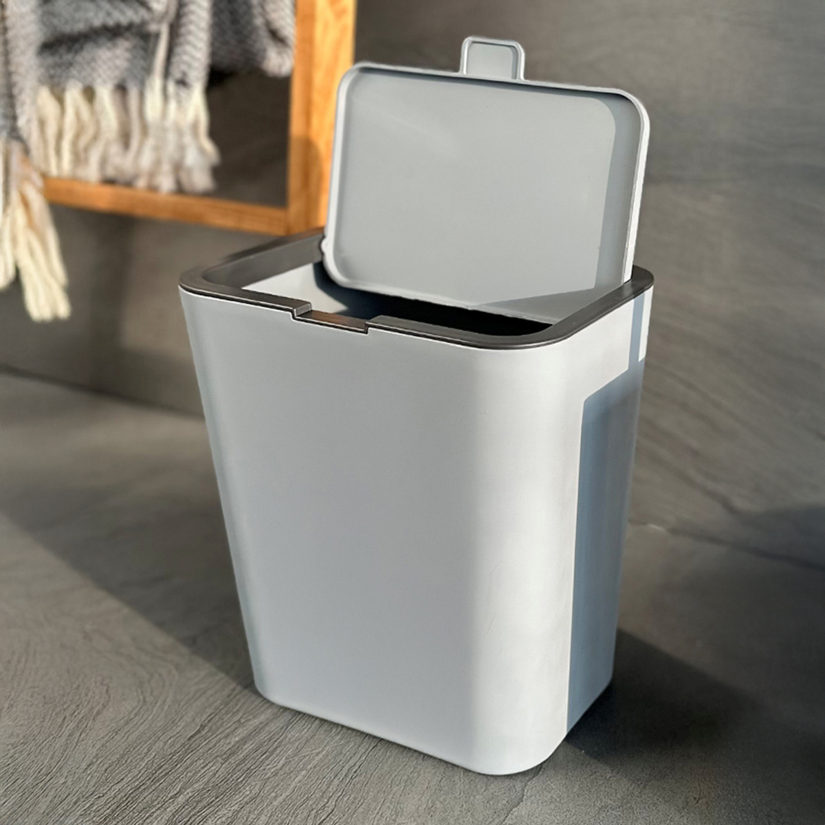The Flip Trash Bin brings organization to every corner of your home with its compact size and modern design. It can be used in the kitchen, bathroom, or office as a trash bin or an organizer. Its durable plastic body ensures long-lasting use, while its spacious capacity makes it practical for everyday needs. The refreshing green tone adds a modern touch to your living spaces. Product Details Material: Plastic Color: Grey Pieces: 1 Bin Capacity: 6 Liters Dimensions: Height: 25 cm Width: 22 cm Depth: 15 cm